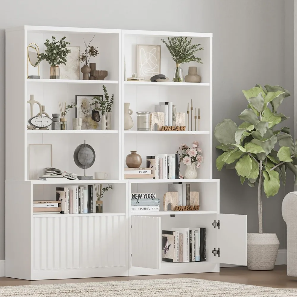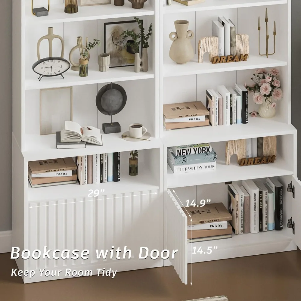 - Generous Storage Capacity: Designed for optimal organization, this bookshelf features two fluted doors that hide additional storage space. With adjustable shelves, you can customize the arrangement to accommodate books, decorative items, or personal treasures. The lower section extends 3.9 inches wider, creating a convenient cabinet shelf for displaying your favorite decor pieces