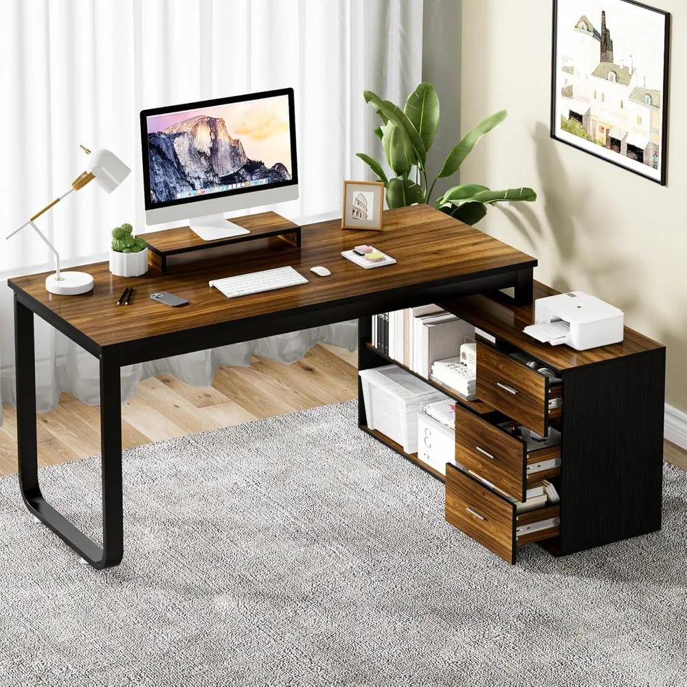 L Shaped with Storage Shelves, Corner Computer Desk with Drawers, Home Office Desk with Removable Monitor Stand,