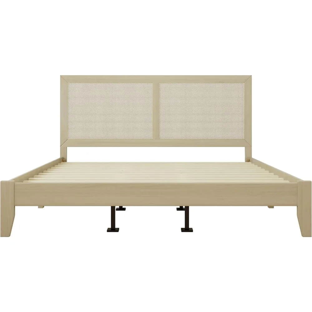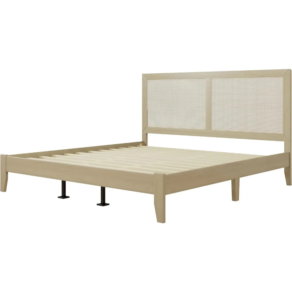 Modern Rustic Solid Wood Platform Bed with Rattan Headboard, California Kin Low Bed Frame No Box Spring Needed/Easy