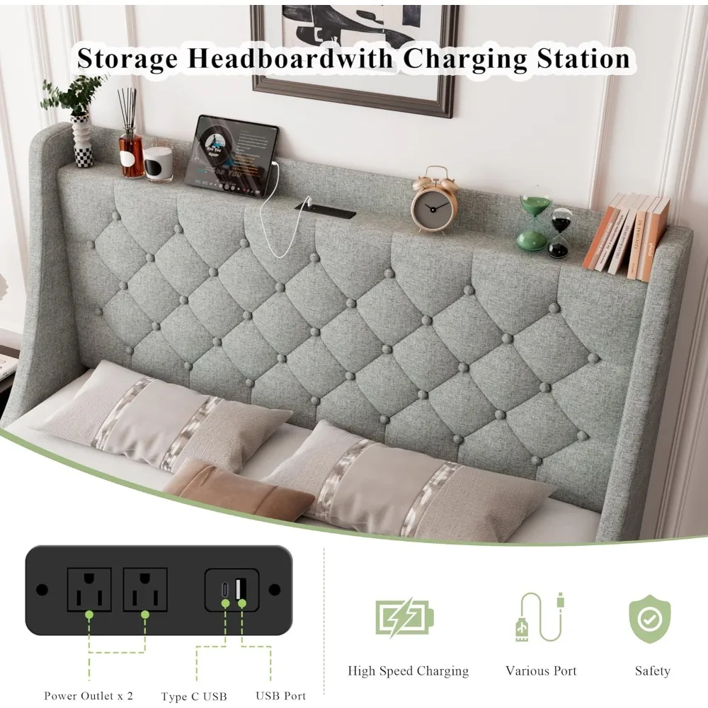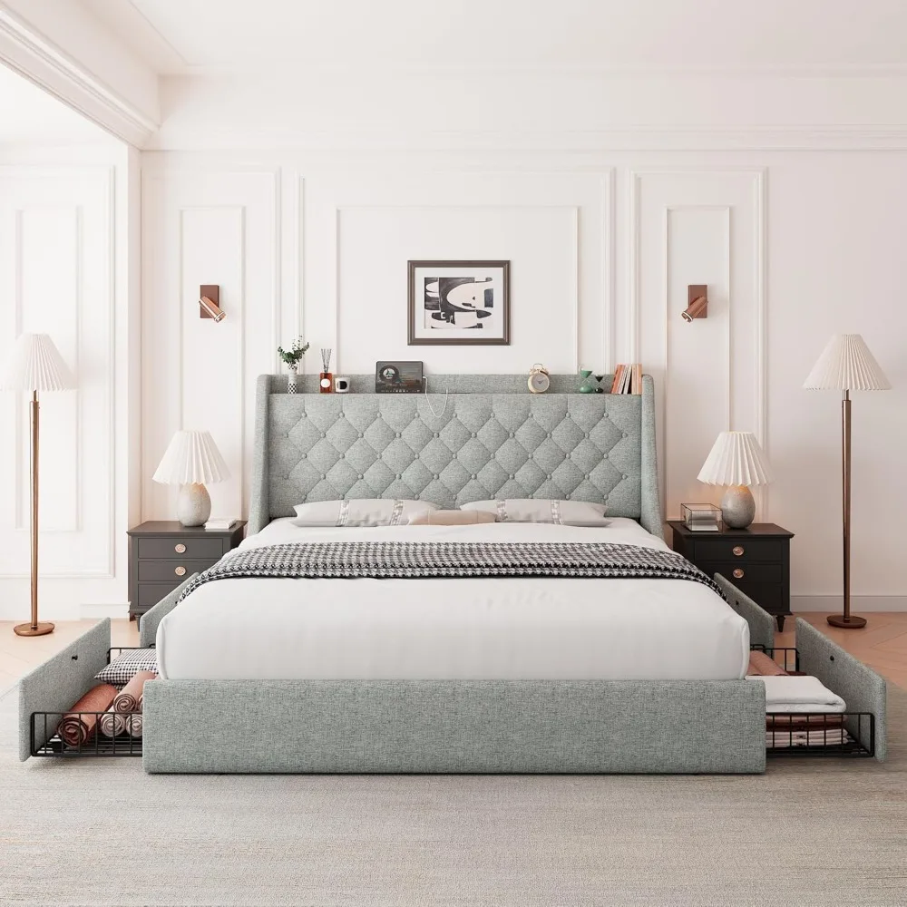 Queen Size Upholstered Bed with Storage Drawers, Wingback Headboard, and Charging Station