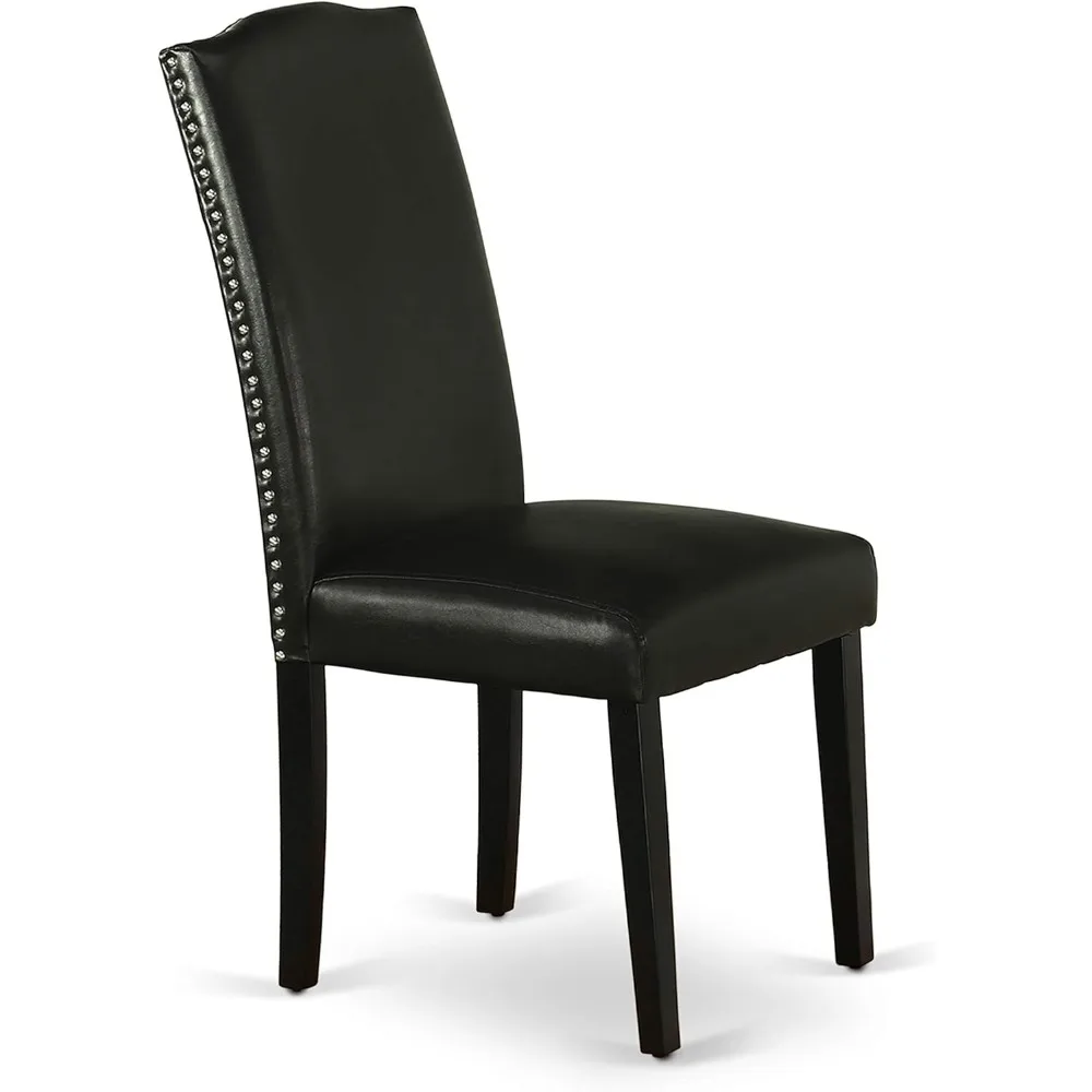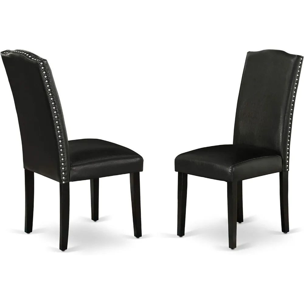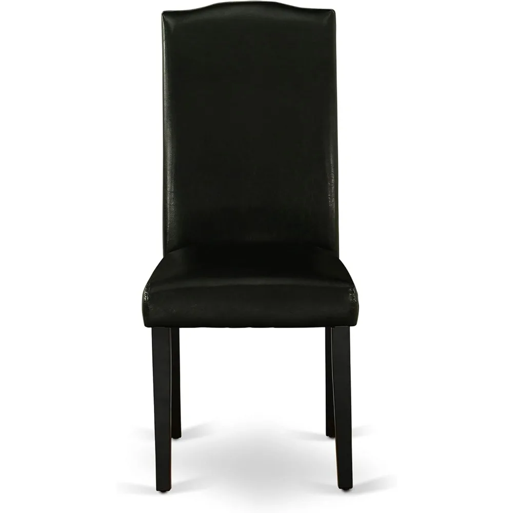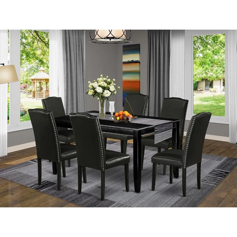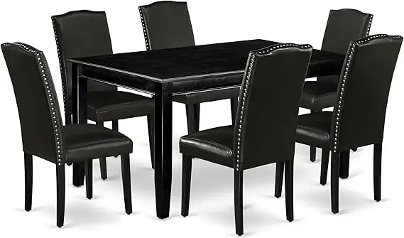This sophisticated 7-piece dining room set features a faux leather finish and a sleek black hardwood construction for a modern and elegant aesthetic. The set includes a 4-legged dining table and six padded parson chairs, designed to enhance the charm of your dining space. With its tasteful design, this wood dining table set is perfect for hosting memorable meals with loved ones and can blend seamlessly with various interior styles. The dining set's finish is sophisticated, with a small dining table and frame made from sleek black hardwood, complemented by exquisite parsons dining chairs with high backs and seats upholstered in luxurious black PU leather. These elements combine to bring a sense of grandeur to your dining area. Constructed from high-quality Asian wood, specifically Rubberwood, this dining set offers remarkable durability. Expertly assembled by seasoned carpenters, the wooden dining table set boasts a smooth and upscale finish. The chairs' backrest and seat are made from premium-grade PU Leather, ensuring comfort and enhancing the overall sitting experience. The resilience of the Asian wood used in the dining table set exemplifies exceptional durability and reliability. The dimensions of the dining table are as follows: Length - 60 inches, Width - 36 inches, Height - 30 inches. The padded parson chairs have dimensions of Length - 24.5 inches, Width - 19 inches, and Height - 40.5 inches. This dining table set arrives in four boxes, with one box containing the table and the other three containing the chairs.