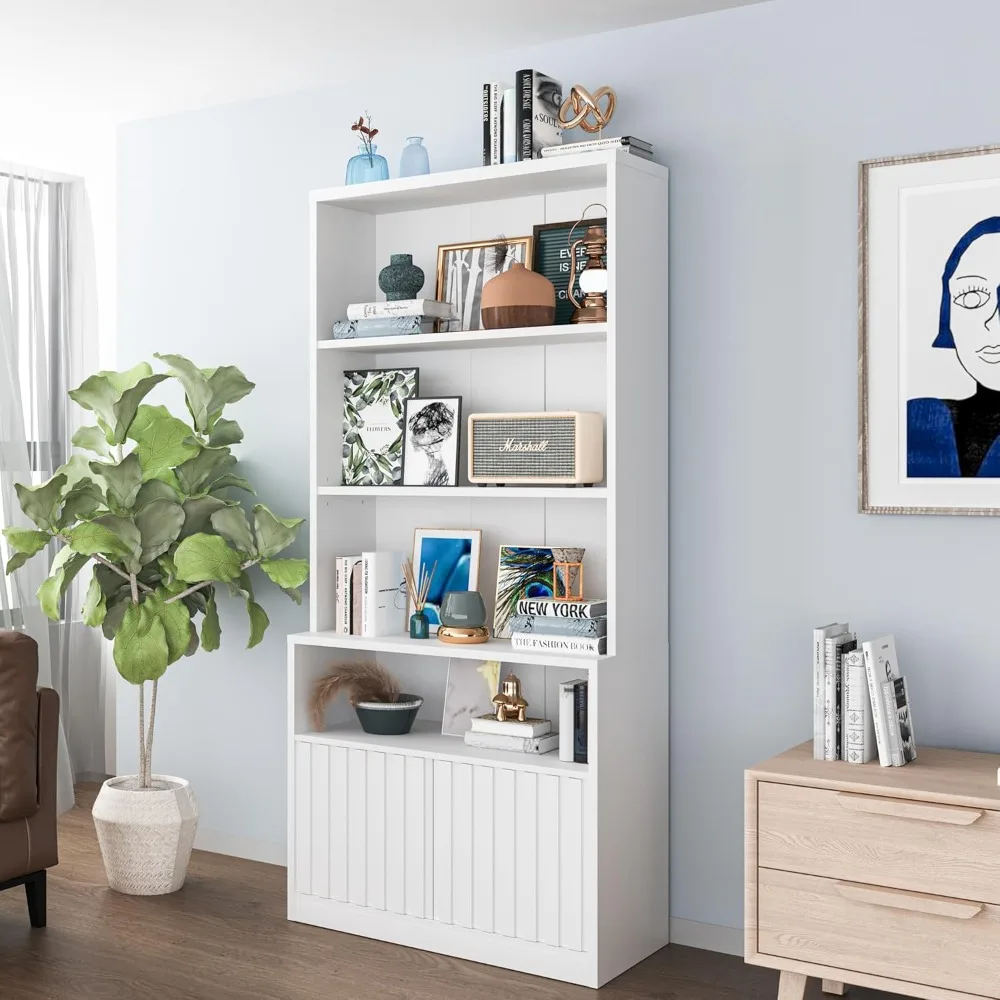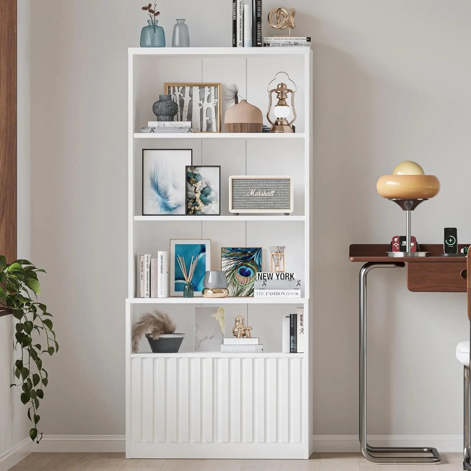 - Generous Storage Capacity: Designed for optimal organization, this bookshelf features two fluted doors that hide additional storage space. With adjustable shelves, you can customize the arrangement to accommodate books, decorative items, or personal treasures. The lower section extends 3.9 inches wider, creating a convenient cabinet shelf for displaying your favorite decor pieces