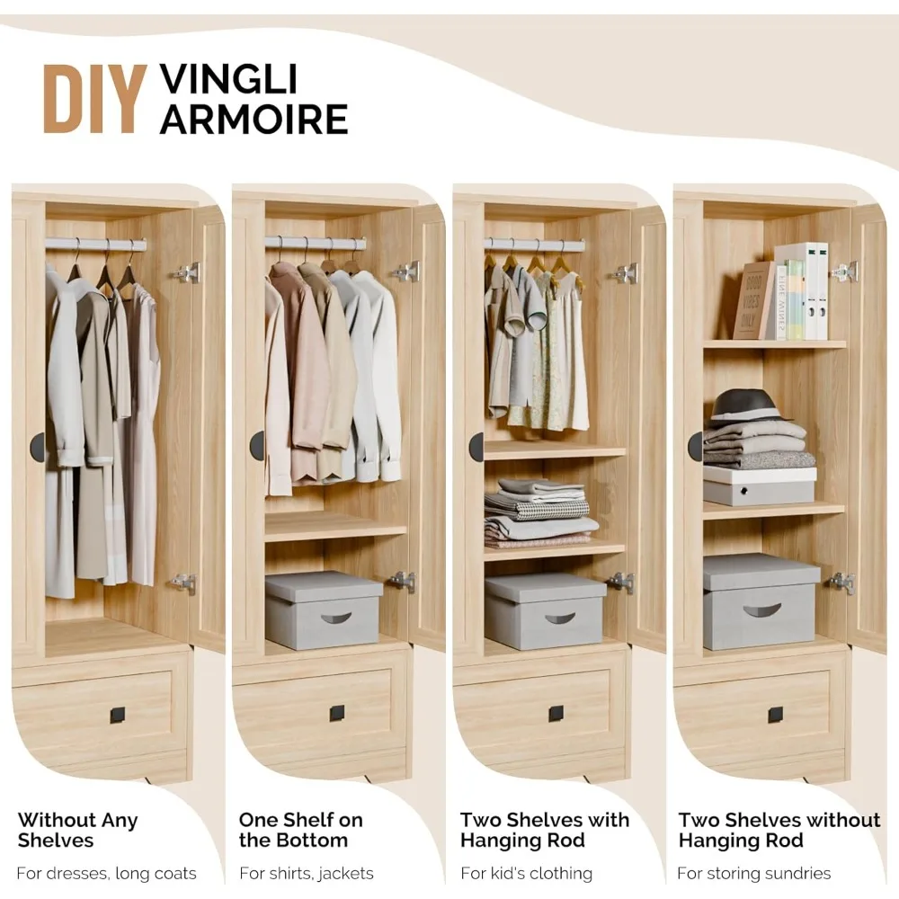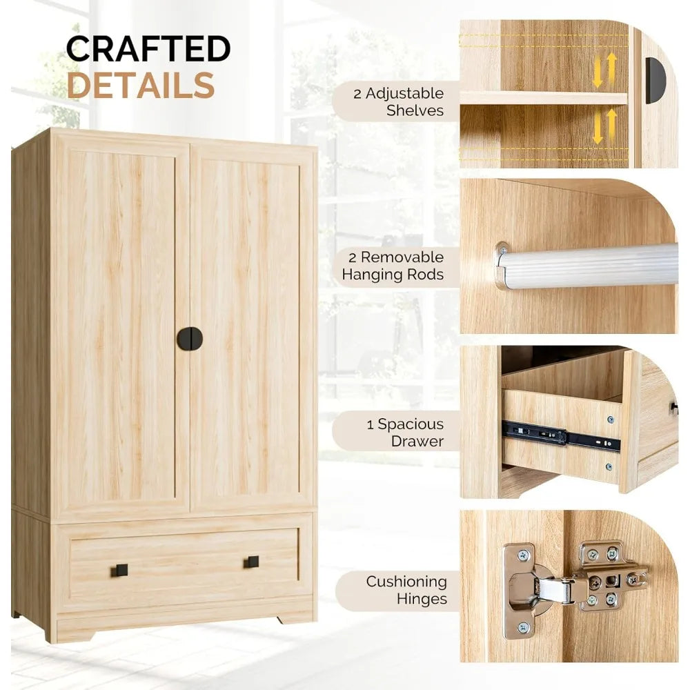 Armoire Wardrobe Closet With Doors, Hanging Rod, Shelves and Drawer - Freestanding Cabinet for Bedroom, Dorm - Oak, 38 W