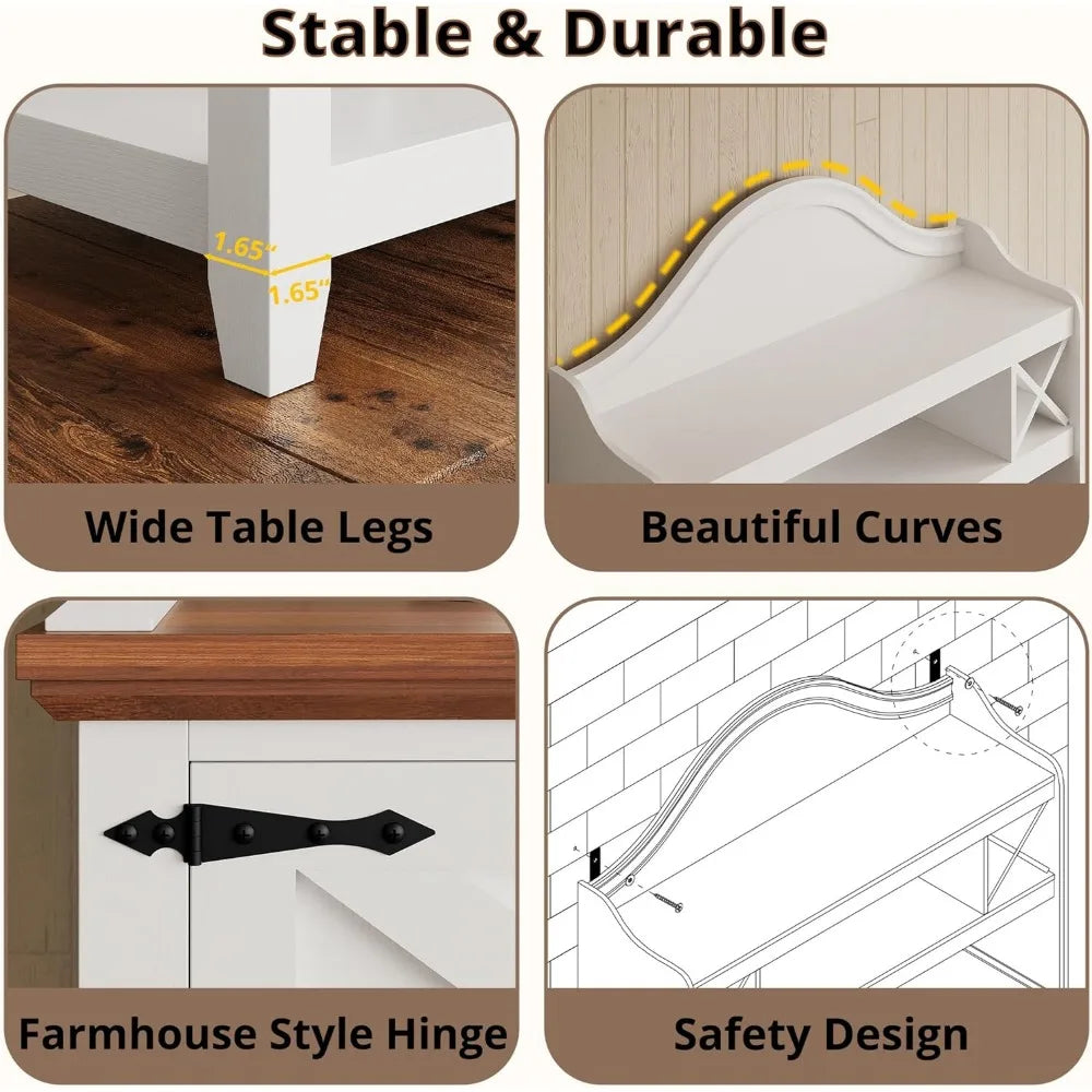 Flexible and Versatile: This large bar cabinet combines a buffet cabinet and upper cabinet to meet your various needs. It can be used as a kitchen pantry, a living room coffee cabinet, or a sideboard. After removing the upper half, it can also serve as a console table. The farmhouse-style design adds a touch of rustic elegance to your home