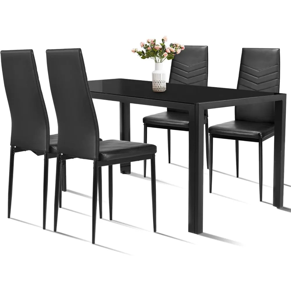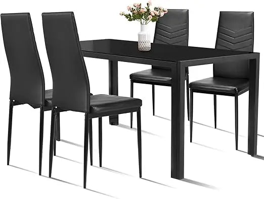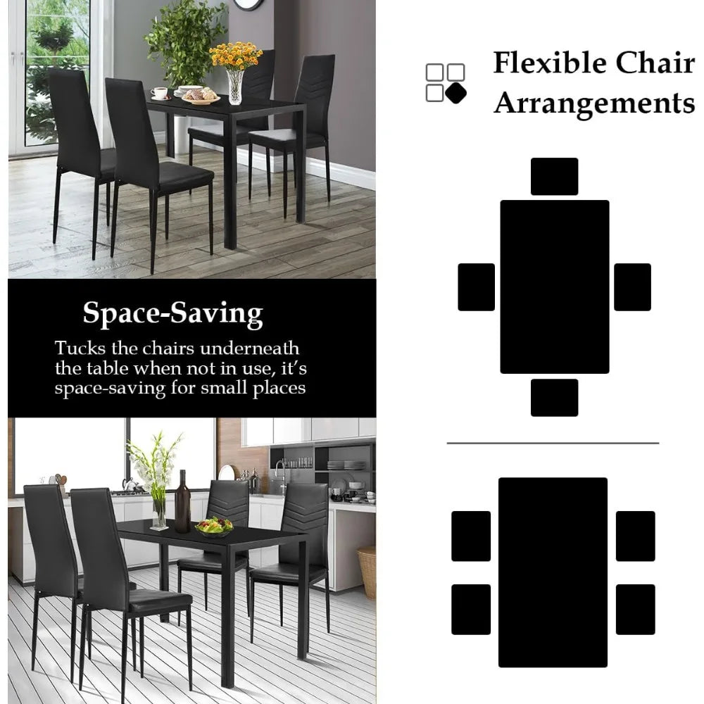 Dining Table Set for 4, 48.5" Rectangle Tempered Glass Kitchen Room Table with 4 Black Faux Leather Dining Chairs, Space-Saving