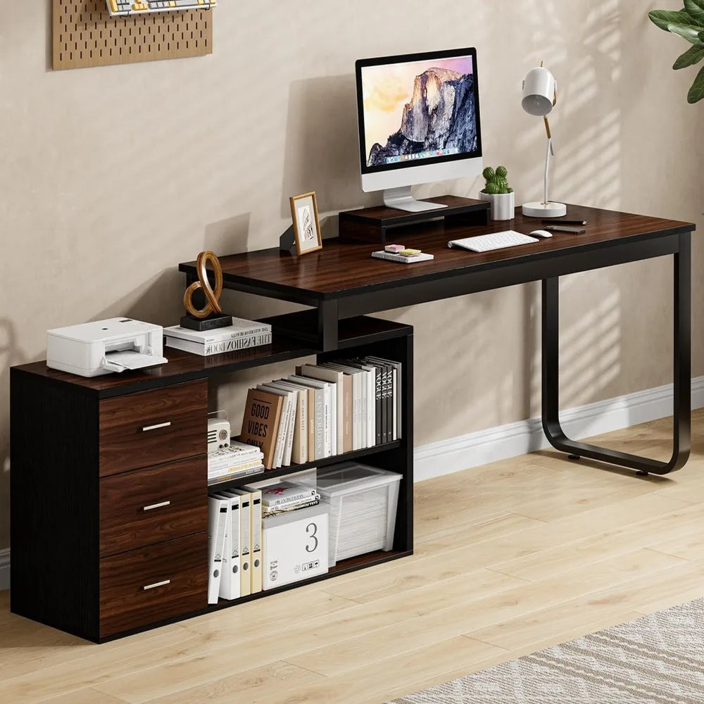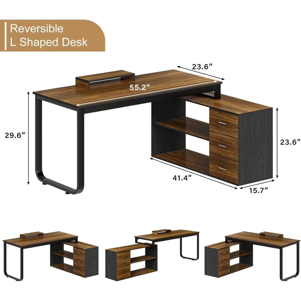 L Shaped with Storage Shelves, Corner Computer Desk with Drawers, Home Office Desk with Removable Monitor Stand,