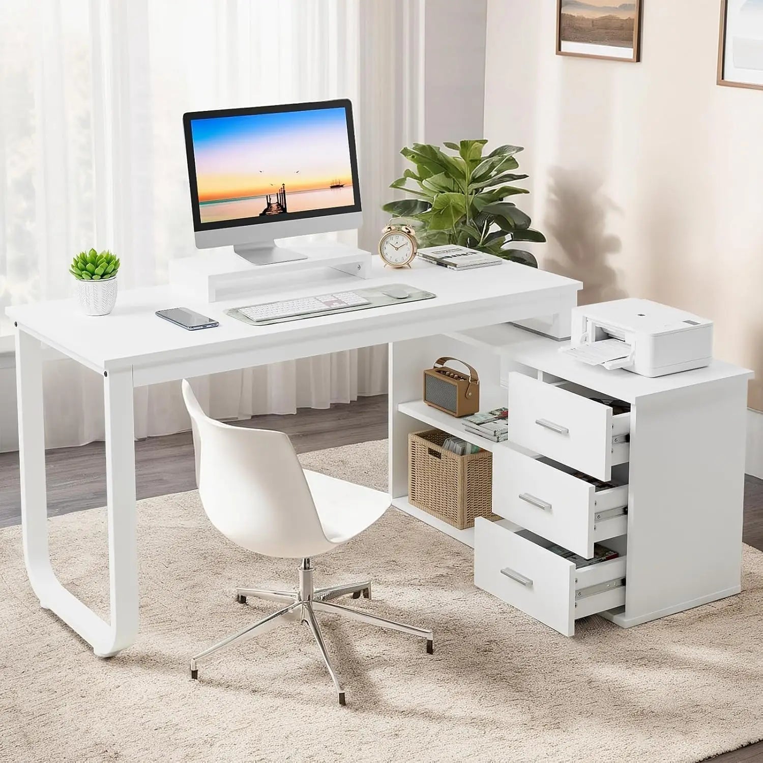 - Sleek Modern Design in Pure White: Elevate your workspace with this L-shaped desk with drawers! The crisp white finish and minimalist design bring a chic, modern vibe to any room. Perfect for home offices, studios, or study corners