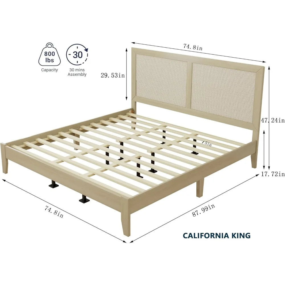 Modern Rustic Solid Wood Platform Bed with Rattan Headboard, California Kin Low Bed Frame No Box Spring Needed/Easy