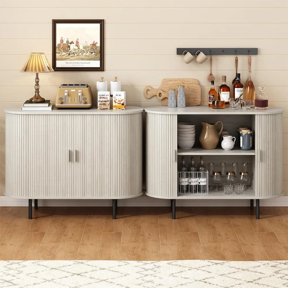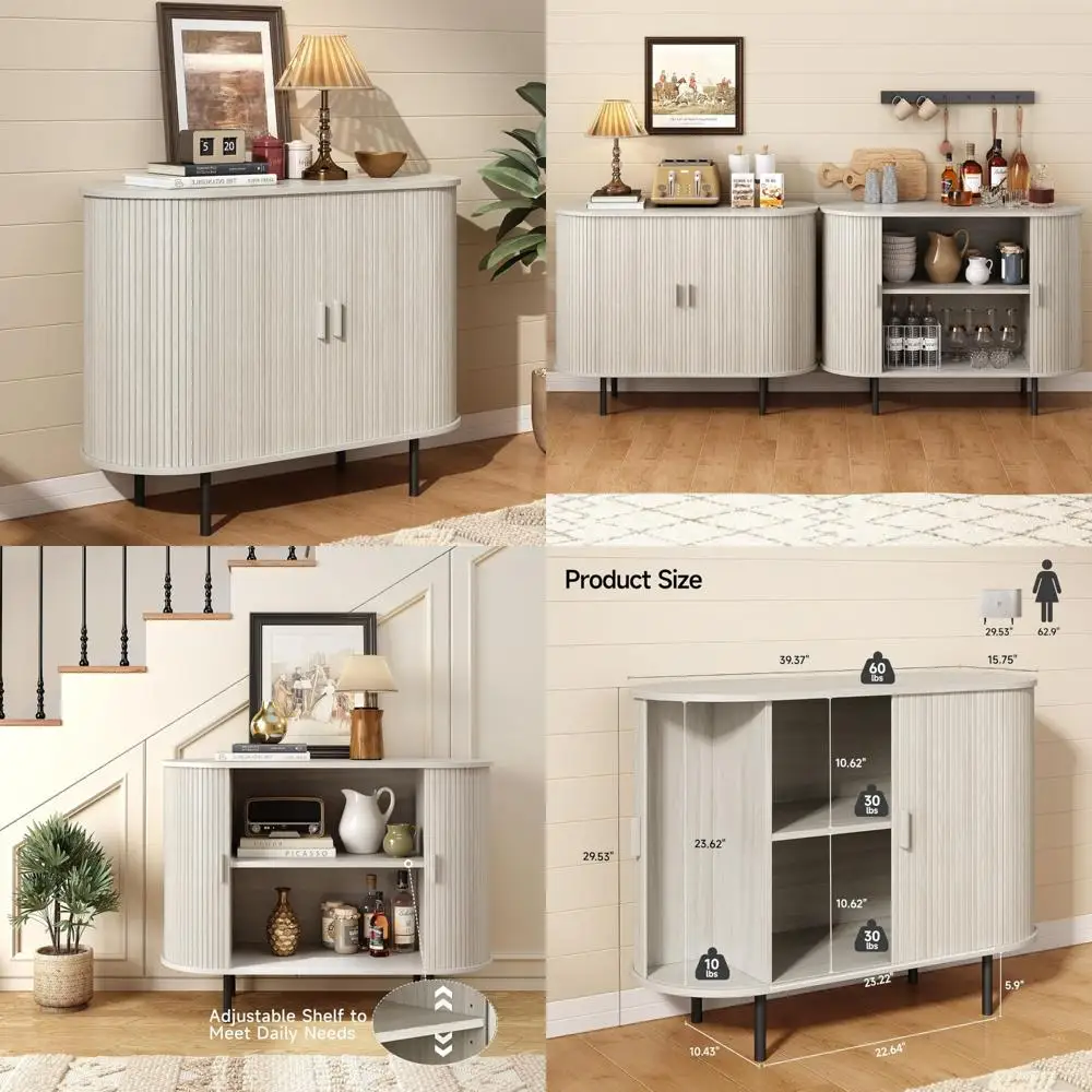 This Sideboard Buffet Cabinet is crafted with curved edges, offering a sleek and stylish look that complements any room. It features a sliding door mechanism for smooth operation, and its compact design ensures ample storage space without taking up too much room. The cabinet boasts two storage compartments on either side, providing ample space for various household items and keeping them organized. An adjustable shelf offers three different height settings to accommodate different storage needs. The cabinet's versatility makes it suitable for multiple uses, such as a kitchen buffet, a wine or coffee bar, a console table in the hallway, or an accent cabinet in the living room. Its design allows it to blend seamlessly into any room of the house. Made from high-quality materials, this sideboard is built to last, with a sturdy construction that keeps your belongings secure. The cabinet's smooth and rounded edges prevent accidental bumps, and it comes with a wall-mounting kit for added stability. Assembly is straightforward, with all parts and accessories clearly numbered and detailed instructions provided for each step. The sliding door design simplifies the installation process, making it easy to follow and understand. Quality checks are conducted before delivery to ensure you receive a well-crafted product.