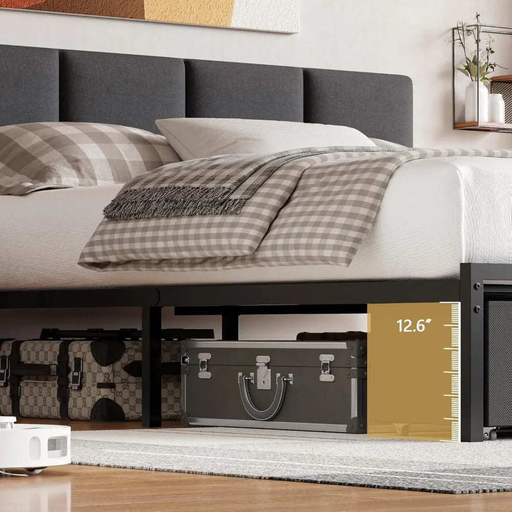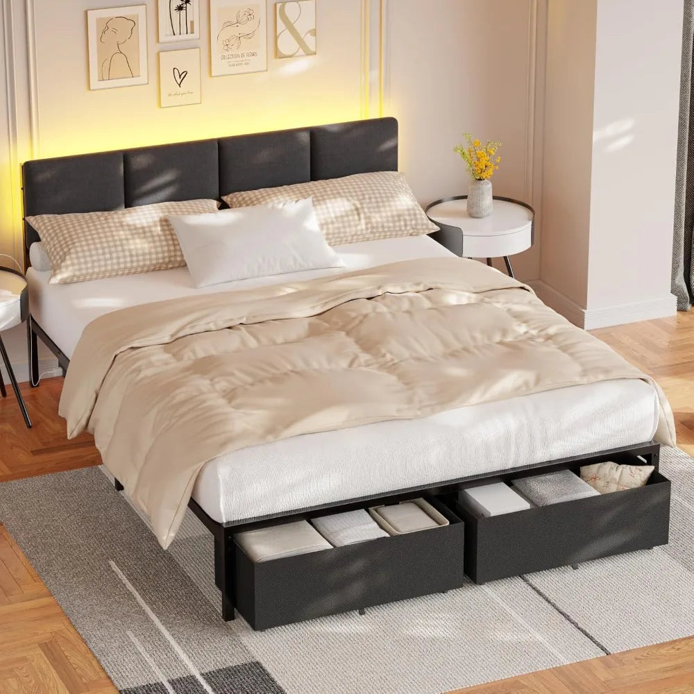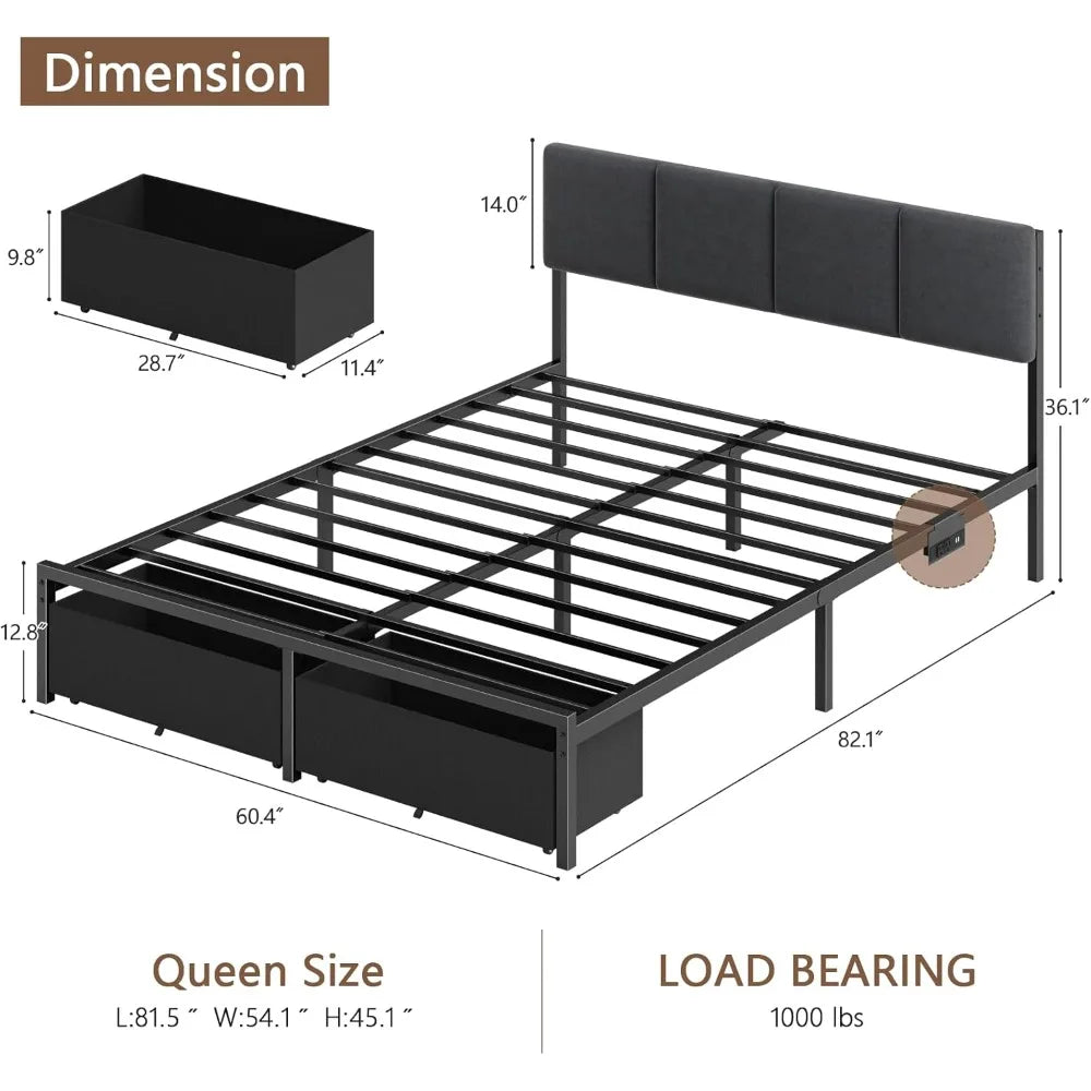 Queen Bed Frame with Headboard and Storage Drawer, Platform Bed Frame Queen Size, Upholstered Bedframe with Charging
