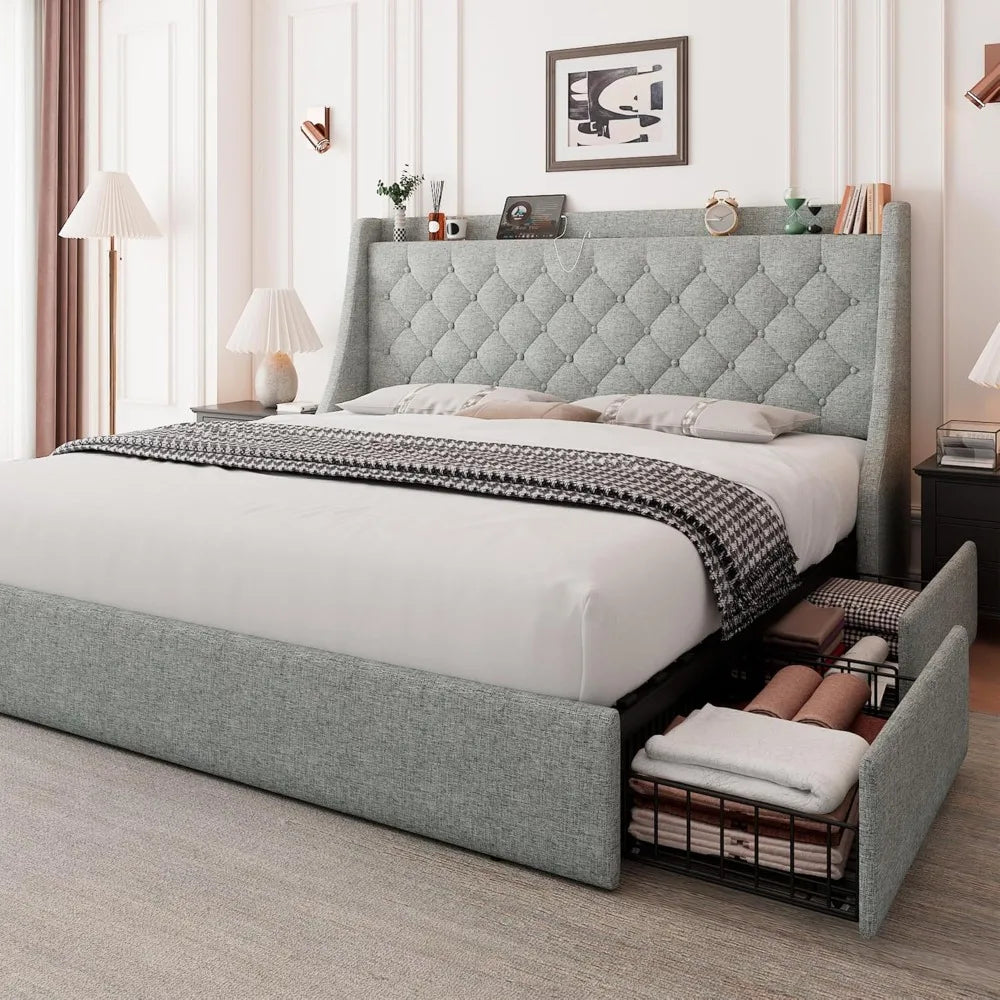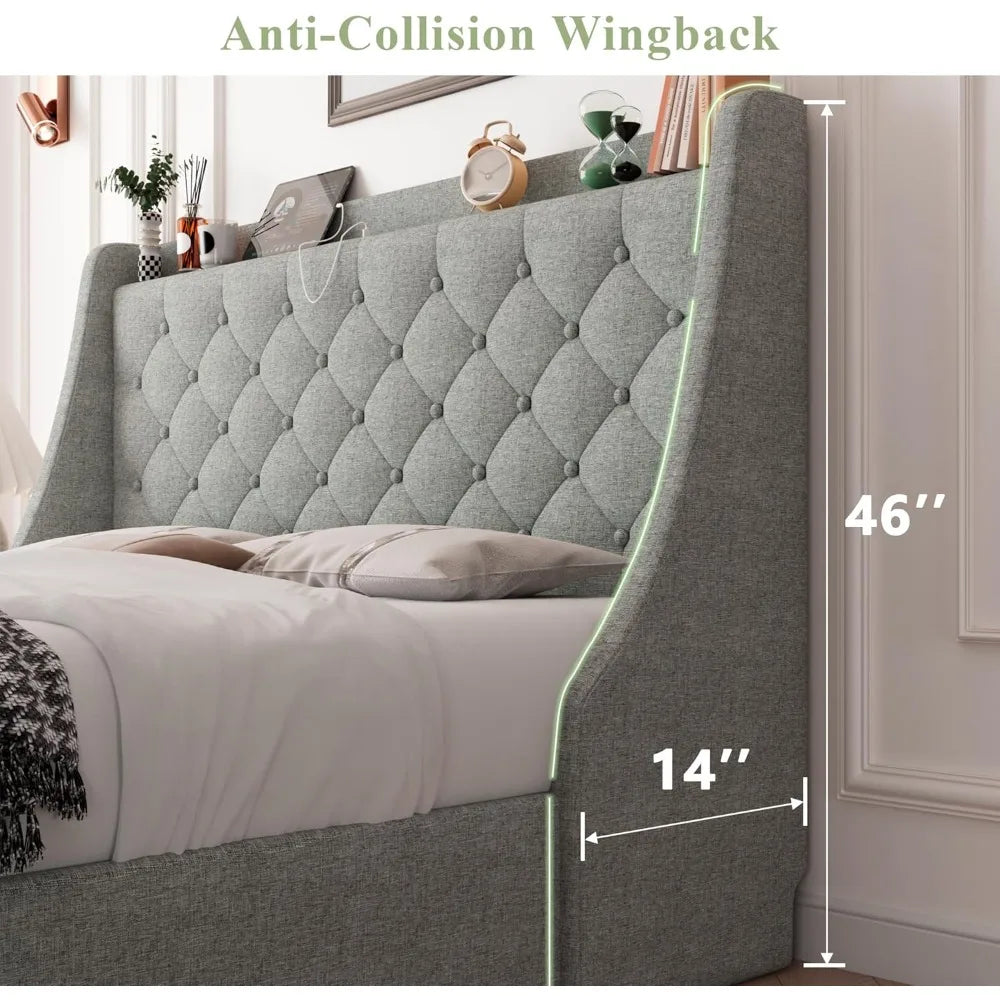 Queen Size Upholstered Bed with Storage Drawers, Wingback Headboard, and Charging Station