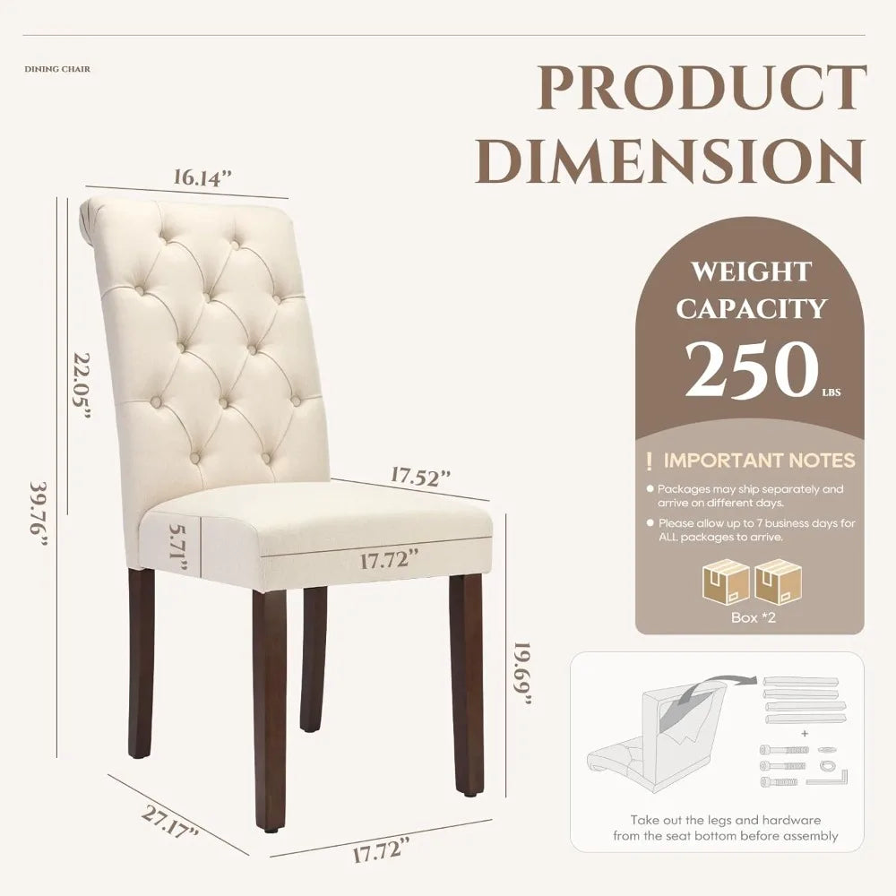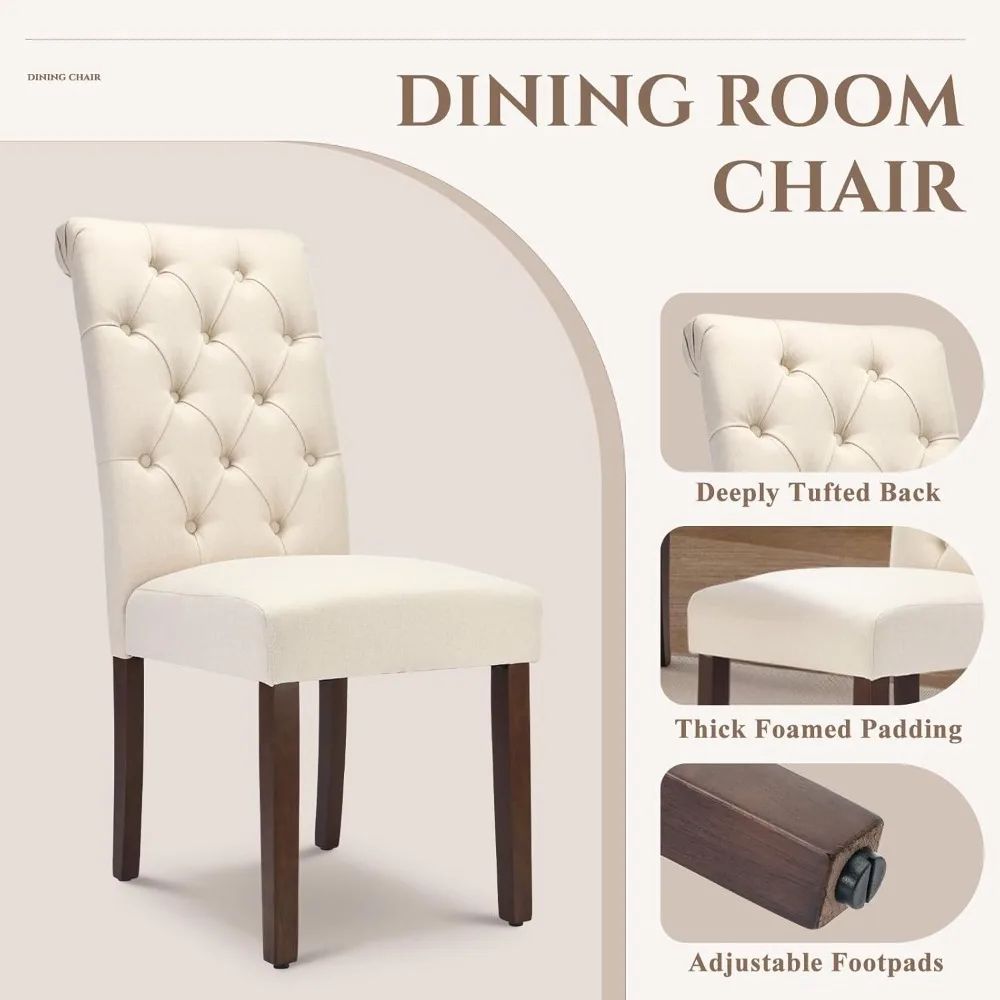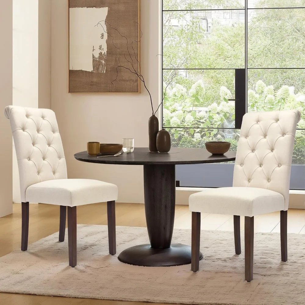This dining chair set boasts an elegant and contemporary design, highlighted by diamond-shaped tufting and deep-set buttons that lend an air of sophistication. With clean lines and a modern aesthetic, these chairs effortlessly complement various home decor styles, while their upholstered parsons design fosters a cozy and welcoming dining ambiance. The chairs are upholstered in a soft, breathable linen fabric that not only offers comfort but is also easy to maintain. The cushioned seats and high backs provide both support and comfort, making them ideal for long periods of sitting, whether in the dining room, living room, or waiting area. Designed with ergonomics in mind, the high-backed chairs feature a slightly curved backrest that conforms to your body shape, offering protection for your back and waist while alleviating the strain of extended sitting sessions. They are perfectly suited for use at your dining table. Built for durability, these kitchen chairs are constructed with solid rubberwood legs that provide robust support, ensuring stability and longevity. The chairs can support up to 250 lbs, and their walnut-finished rubberwood legs come with rubber feet to prevent any damage to your flooring. This versatile set, which includes two chairs, is perfect for family meals, dinner parties, or any special occasion. It can be used daily or for special events such as meetings, weddings, and other celebrations. These chairs are suitable for use in dining rooms, living rooms, meeting rooms, hotels, restaurants, or any other setting requiring ceremonial seating arrangements.