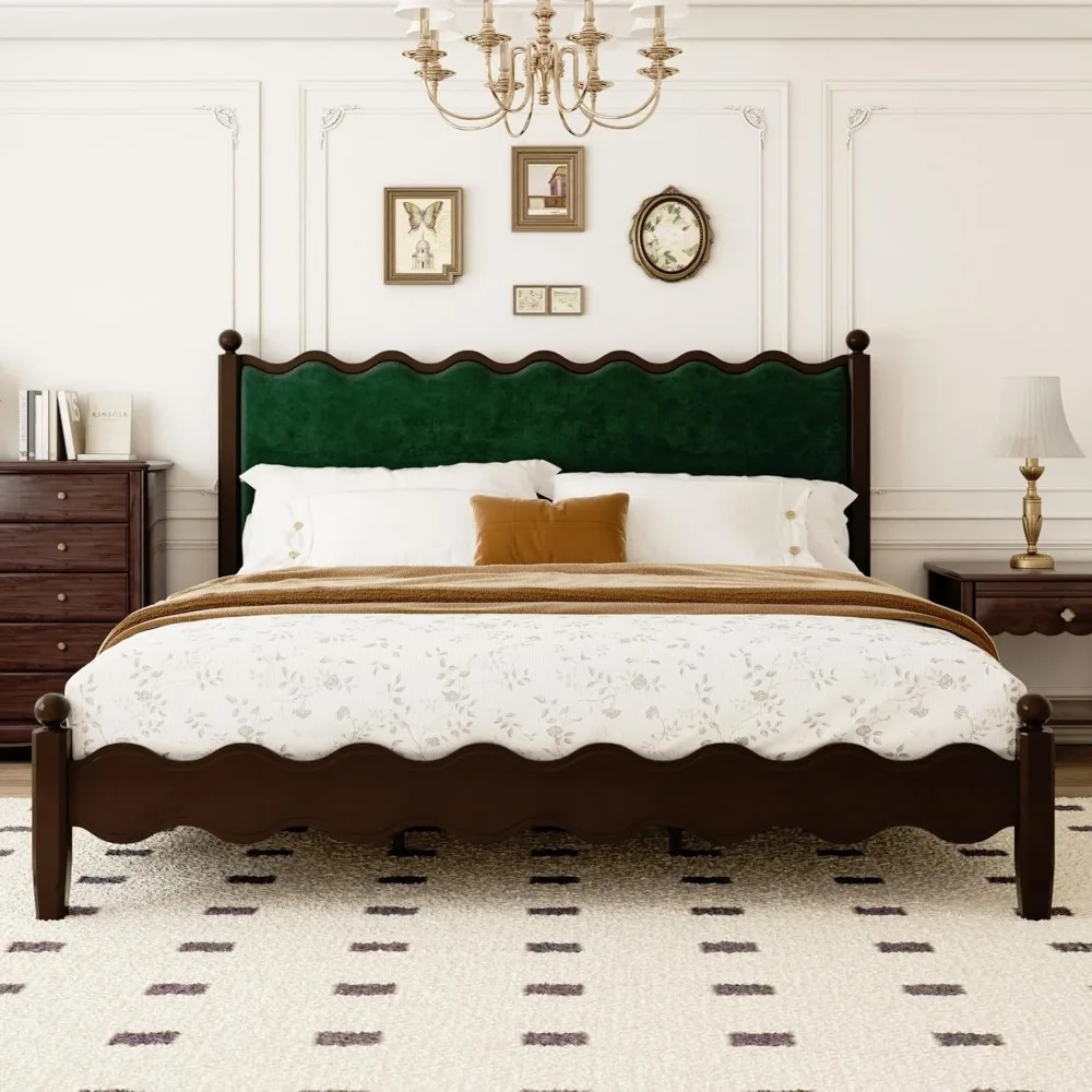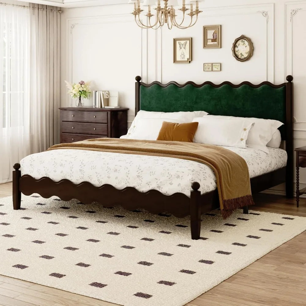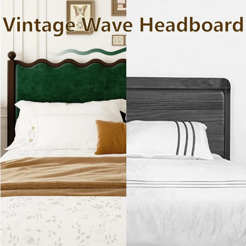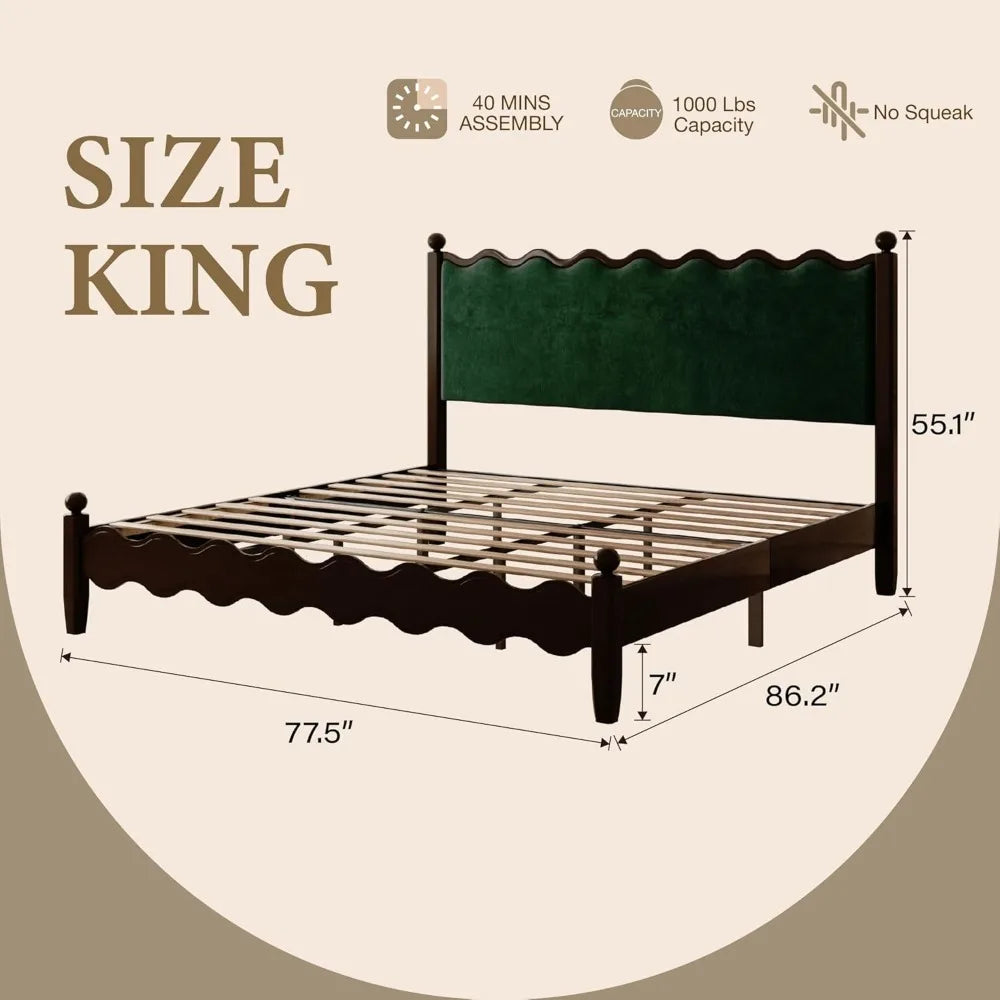 Wood Bed Frame King with Vintage Wave Headboard, 55.1" Tall Velvet Upholstered Bed Frame, Mattress Foundation