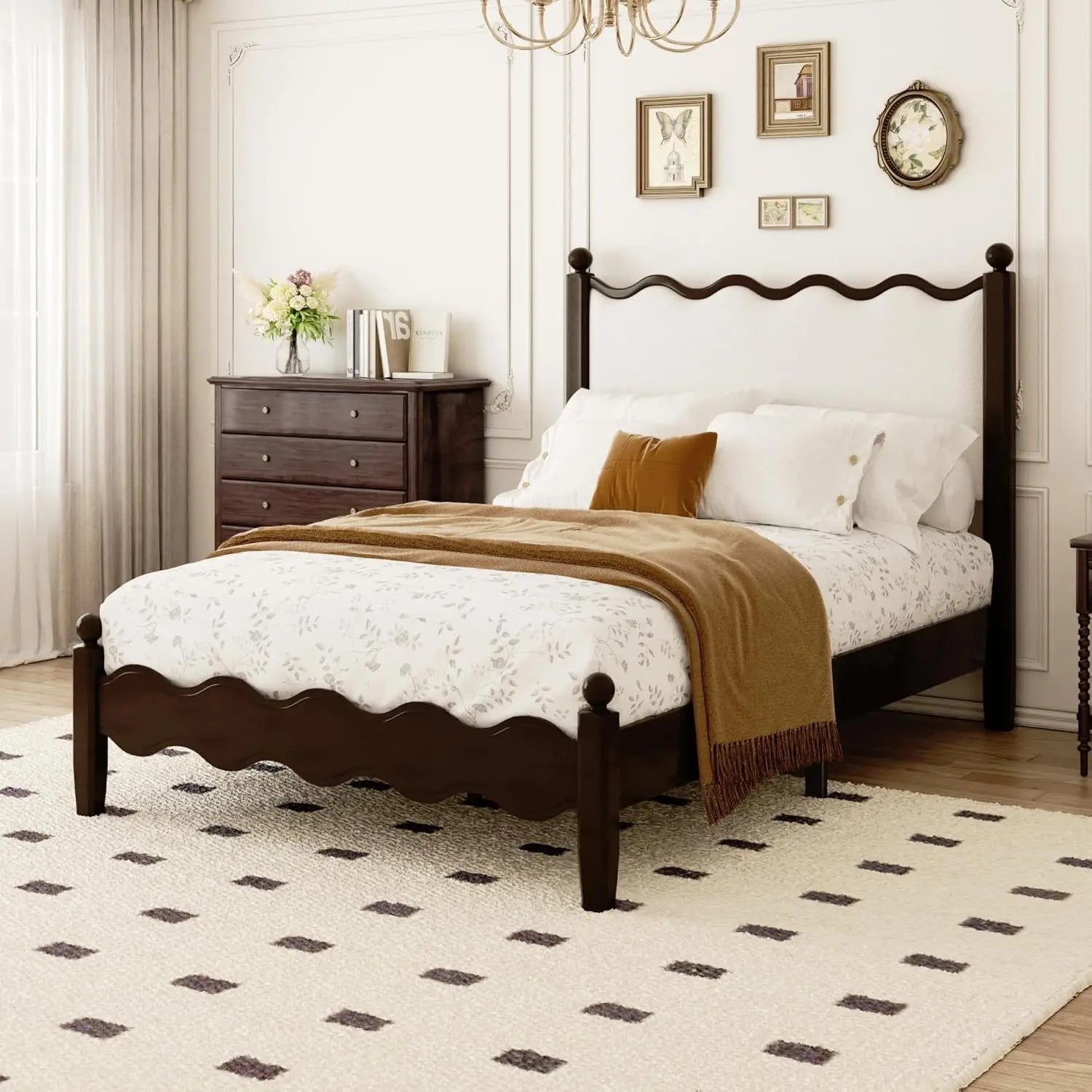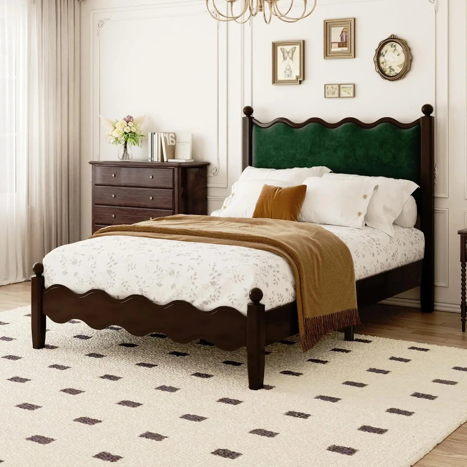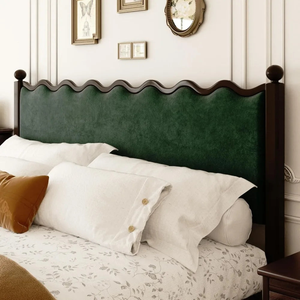 Wood Bed Frame King with Vintage Wave Headboard, 55.1" Tall Velvet Upholstered Bed Frame, Mattress Foundation